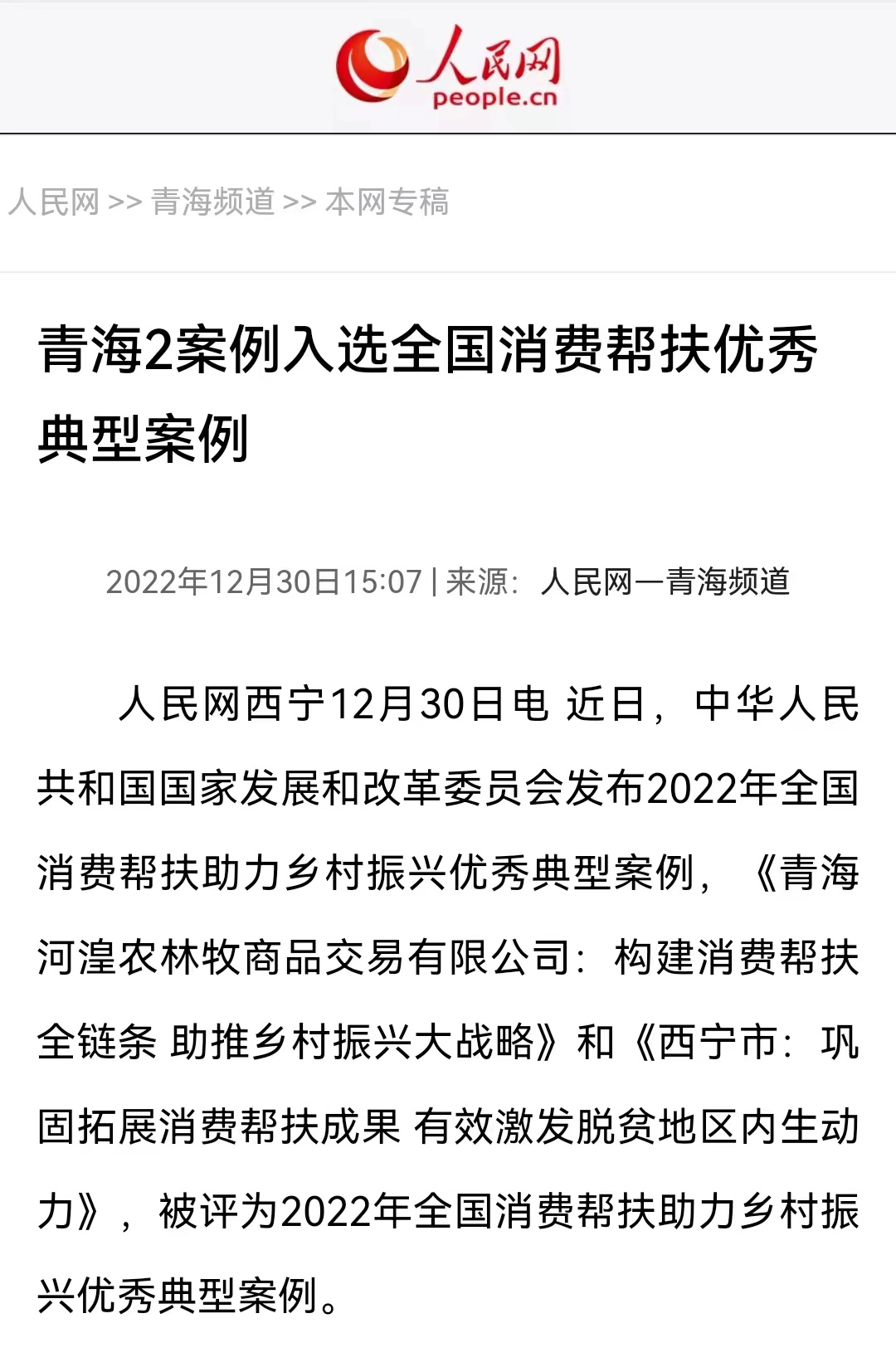 人民網西寧12月30日電 近日,中華人民共和國國家發展和改革委員會發布2022年全國消費幫扶助力鄉村振興優秀典型案例,《青海河湟農林牧商品交易有限公司(青海農林牧商品交易中心):構建消費幫扶全鏈條 助推鄉村振興大戰略》被評為2022年全國消費幫扶助力鄉村振興優秀典型案例。